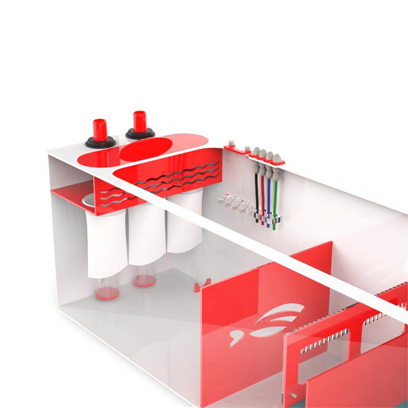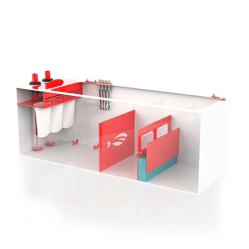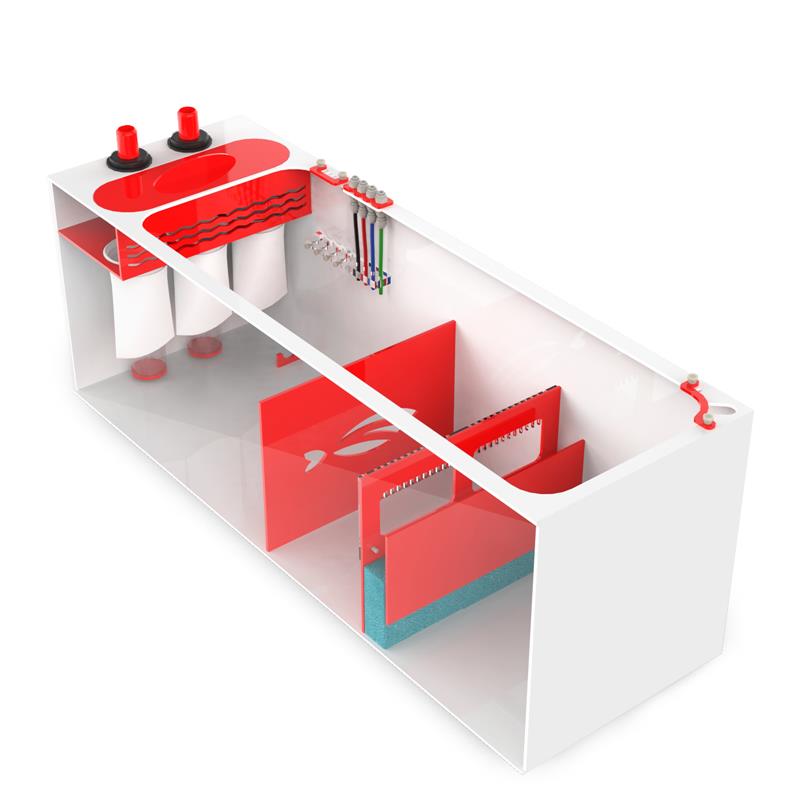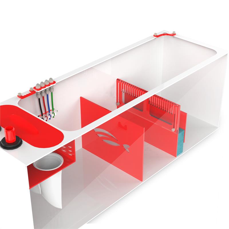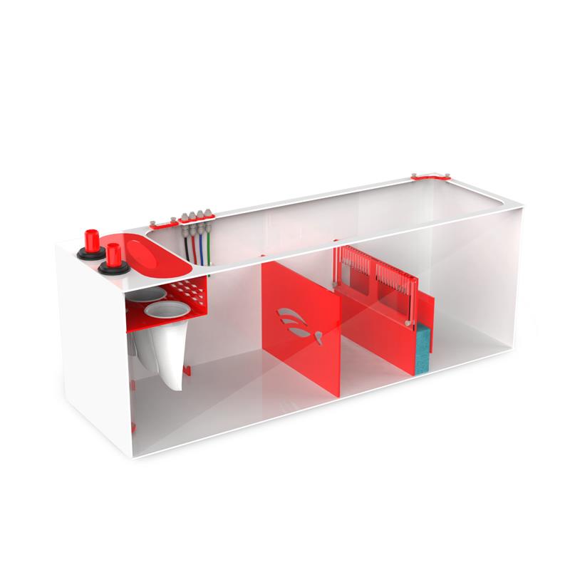The Red Flex Reef Sump is designed specifically for saltwater systems. This sumps features a modern red and white acrylic design. Water flows through the two overflow ports, into our proprietary bubble diffusers and through the 4 inch 200 micron filter socks.