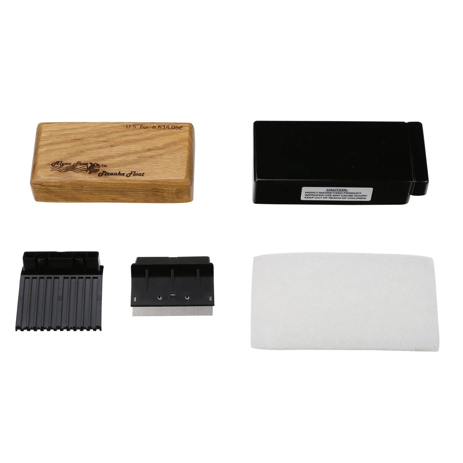 Contents: One outer wood piece, one inner floating scrubber with velcro, one plastic scraper blade for acrylic, one stainless steel scraper blade for glass aquariums, one white acrylic-safe cleaning pad and direction card.