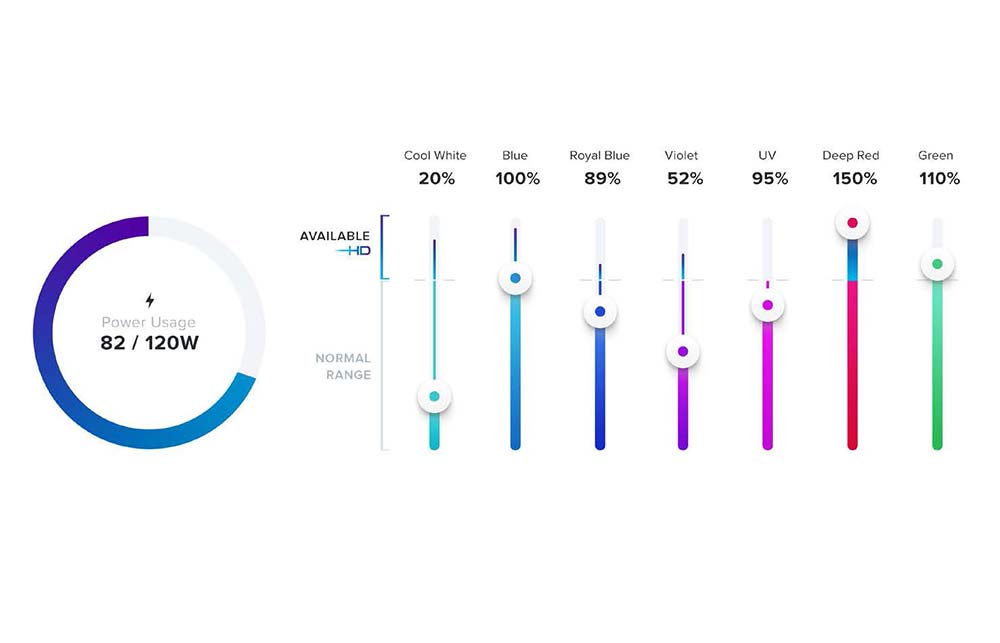 Referring to PAR, the output, color mixing and spread has all been improved. With more LEDs, providing a full spectrum is targeted with TIR lenses that shape the output of the light while improving efficiency. As a result, there is more color pop, a wider spread, and higher average PAR. The combination of LED placement and lens geometry help blend the light cluster, reducing the color separation.