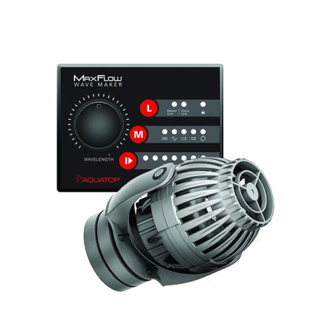 Aquatop’s MaxFlow Series of DC Wave Makers are powerful, highly efficient direct current wave making pumps that move and draw water in a unique way. The Prop-Style Impeller and 360˚ uniform water draw create a wider distribution of flow when compared to traditional powerheads. The MaxFlow DC Wave Maker Pumps also include a strong, secure magnet mounting system which allows for flexible placement and offers a wide range of motion. Each model runs quietly and efficiently, with multiple flow modes and a wavelength frequency dial for precise control. Two or more units can be synchronized wirelessly for enhanced water movement and circulation throughout your aquarium.