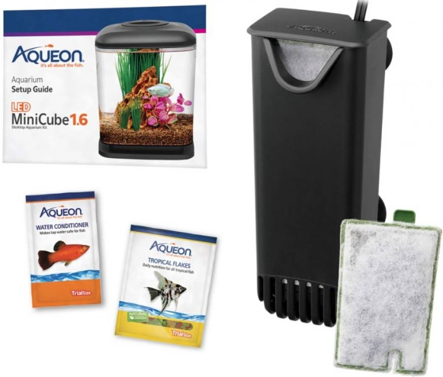 The Aqueon MiniCube 1.6 LED Desktop Aquarium Kit is a great starter kit for all ages. Its contoured design gives it a contemporary look, while being small enough to place in any office or bedroom. This aquarium is ideal for a single betta or a few small tropical fish. It includes LED lighting, an elevated base, internal filtration with cartridge, food and water conditioner and easy to follow setup guide.