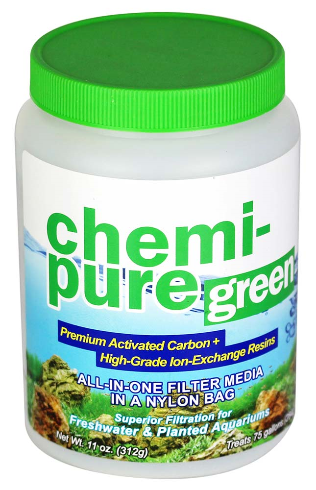 Chemi-pure Green is the ultimate all-in-one filtration media for freshwater planted aquariums. Conveniently packaged in an easy to use nylon bag. Chemi-pure Green is formulated to offer superior filtration without removing either micro or macro nutrients. Chemi-pure Green combines the highest grade of low dust pelletized activated carbon with premium ion exchange resins to produce a balanced formula optimized for the health and well-being of your plants while delivering crystal clear water. The proprietary formula significantly reduces tannins, odors, toxins, organic compounds and medications. For a healthy, stable, crystal clear planted aquarium use Chemi-pure Green!