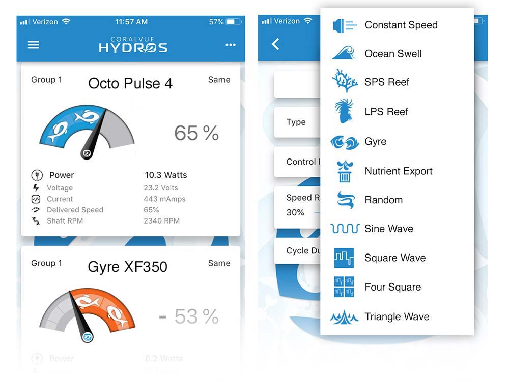 The Hydros App from CoralVue replaces manual controllers and other app controls. The Hydros app can tap into the native control platform to access the preset flow patterns and modes, so you can configure them any way you desire. Connect wirelessly to the Hydros Wave Engine, and get your flow set.