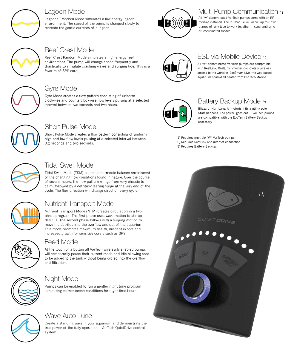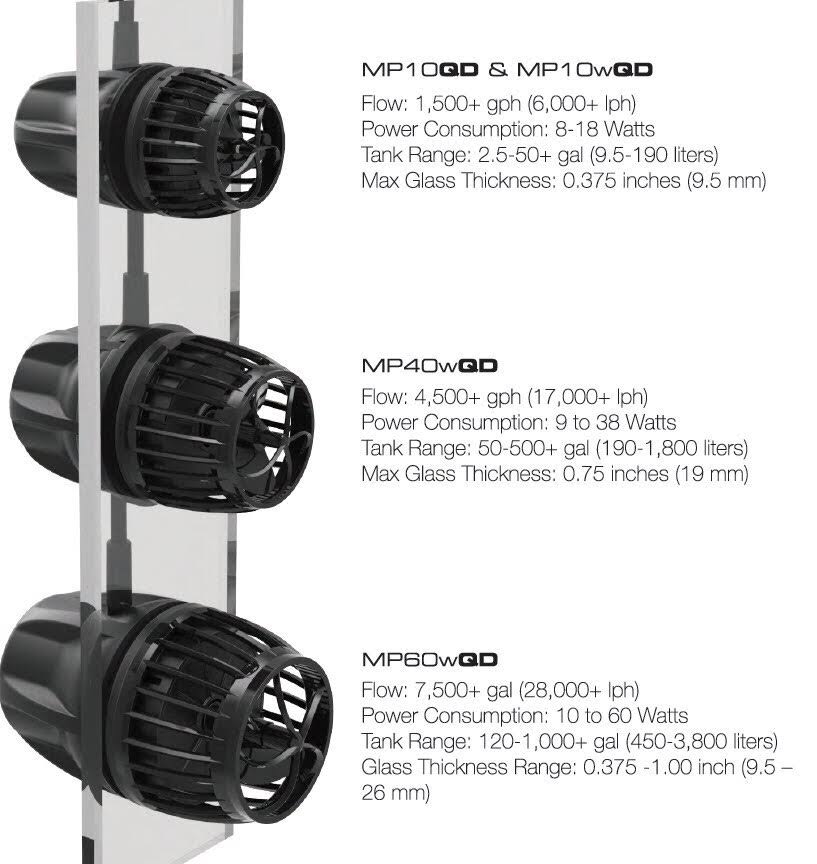 The award-winning technology of the MP40w QuietDrive provides wireless operation on tanks between 50 and 500+ gallons, producing 1,000 to 3,200 gallons per hour of flow and smallest in-tank footprint for full-size reef aquariums.