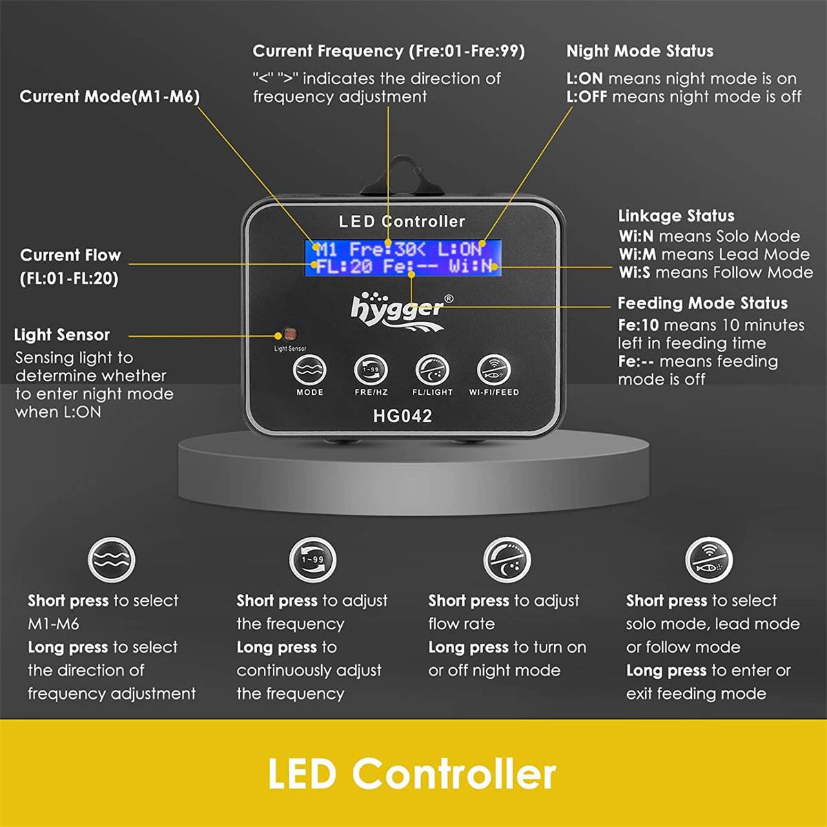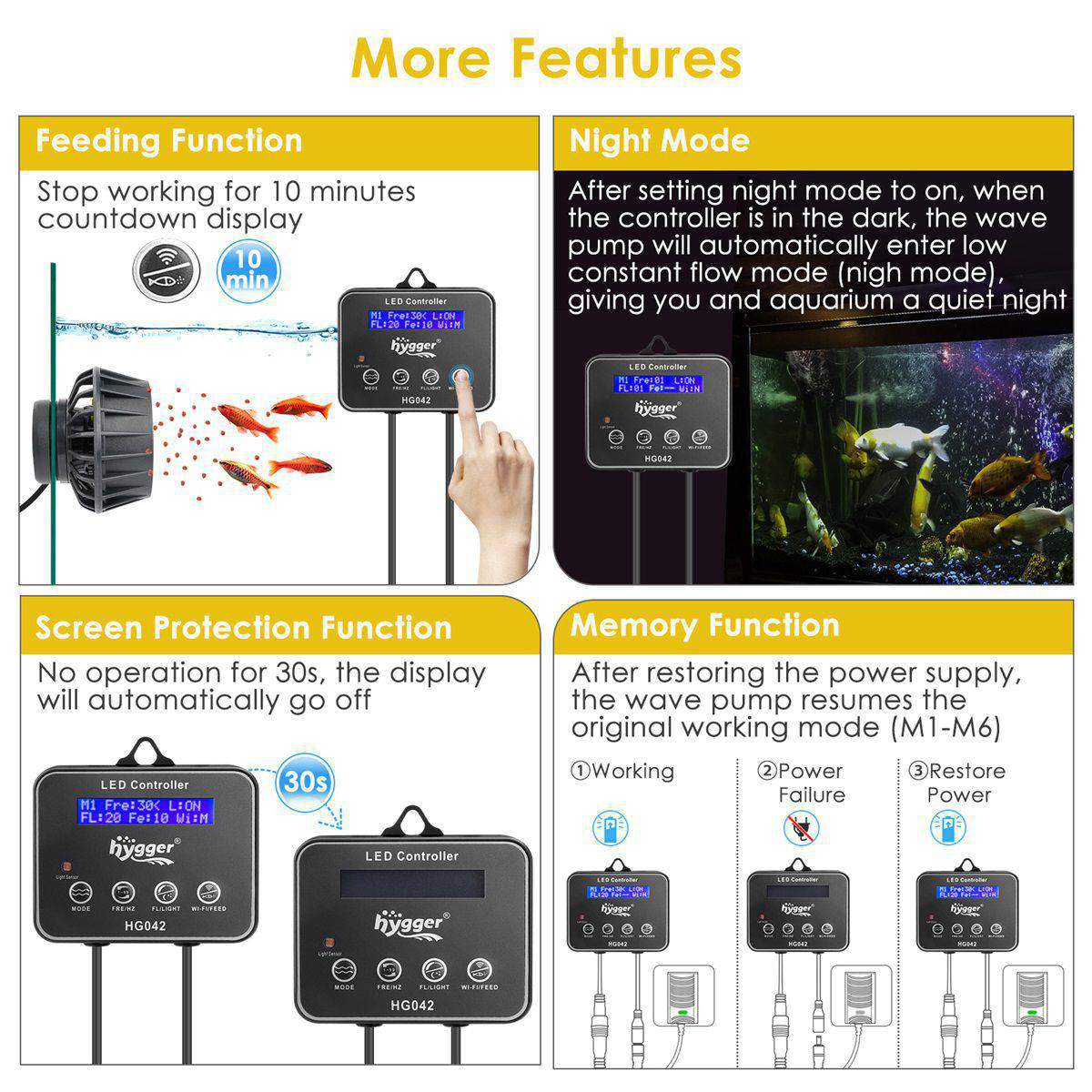 The hygger wavemaker pump has 6 wave-making modes, 20 levels of wave strength, and 99 levels of frequency, which can be adjusted through the LED controller. The wavemaker’s small body is easy to hide in the tank from 75 to 200 gallons, it works powerfully and beautifully.