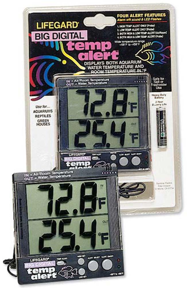 Display both aquarium water temperature and room temperature in degrees Fahrenheit. Has 4 alert features. Alarm will sound and LED flashes: high temp alert only, low temp alert only, both high and low temp alert (air/room), or both high and low temp alert.