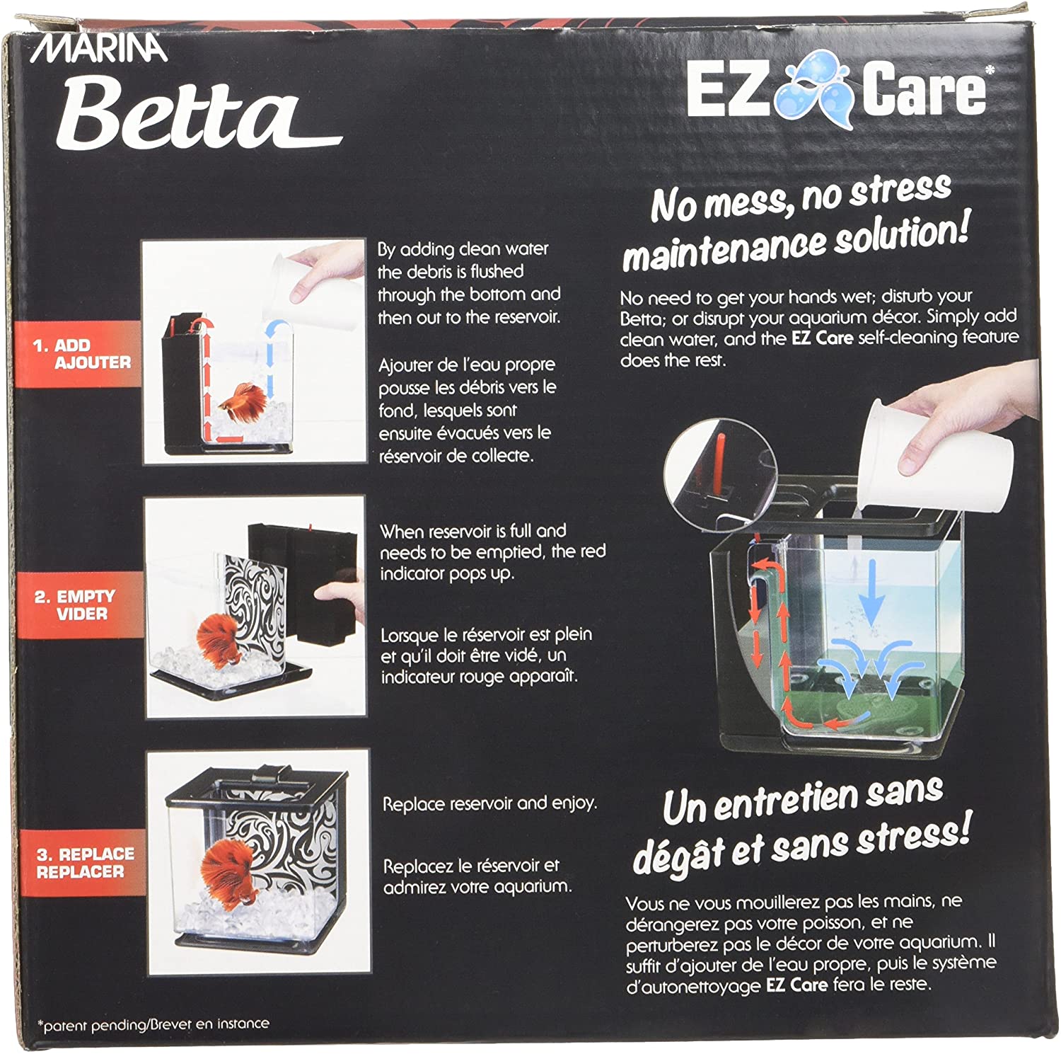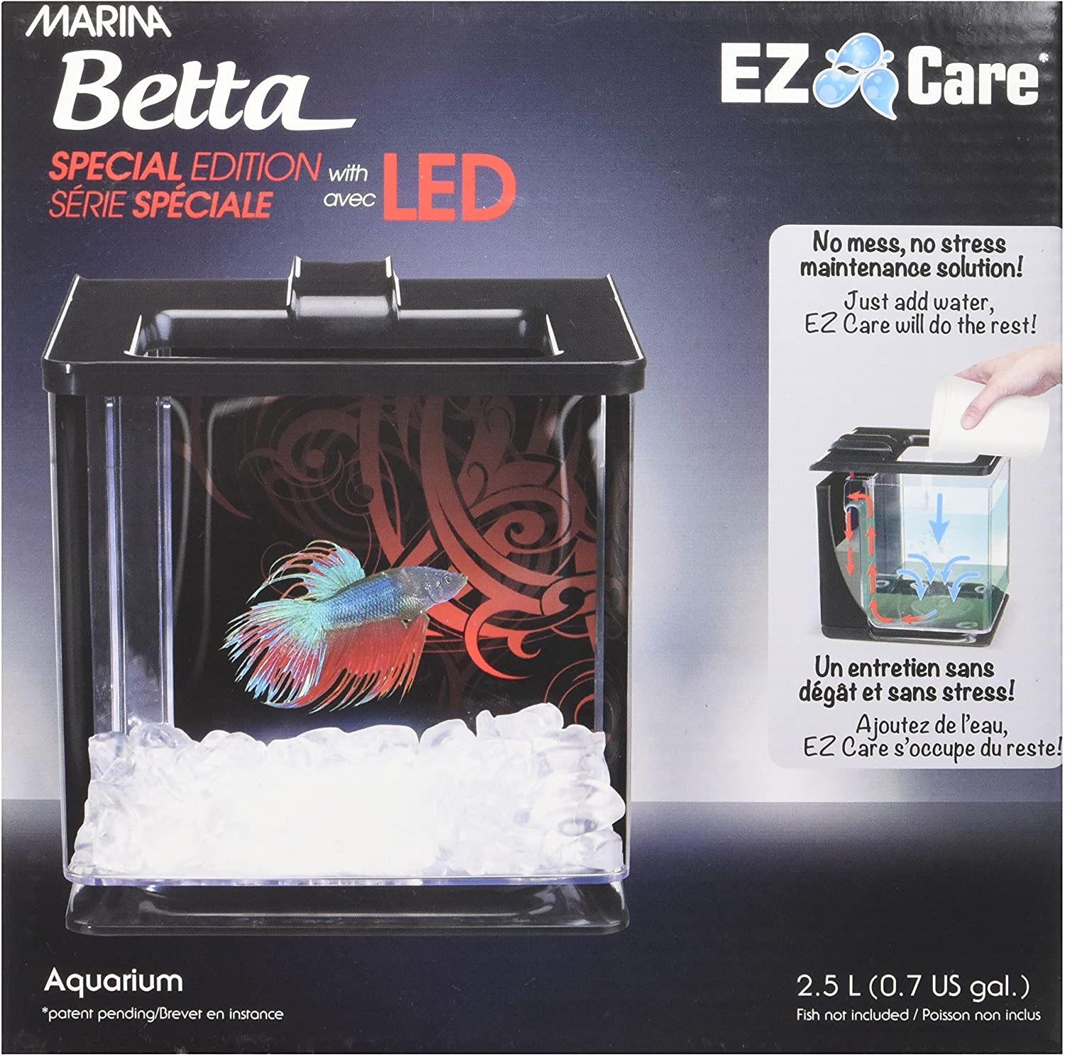 The Marina Betta Special Edition EZ Care Aquarium Kit includes a uniquely designed LED and decorative beads to create a warm ambient glow so you can enjoy your aquarium day and night. The aquarium features the EZ care self-cleaning feature for no mess, no stress water changes - simply add clean water and EZ care does the rest. The aquarium's small size takes up very little space and its chic design allows it to blend in nicely with a variety of household or office settings such as counters, desks, bookshelves or coffee tables.