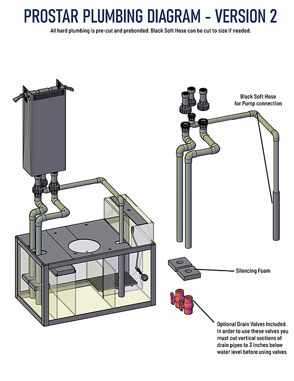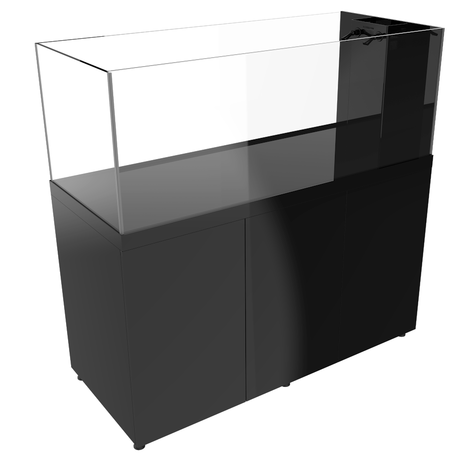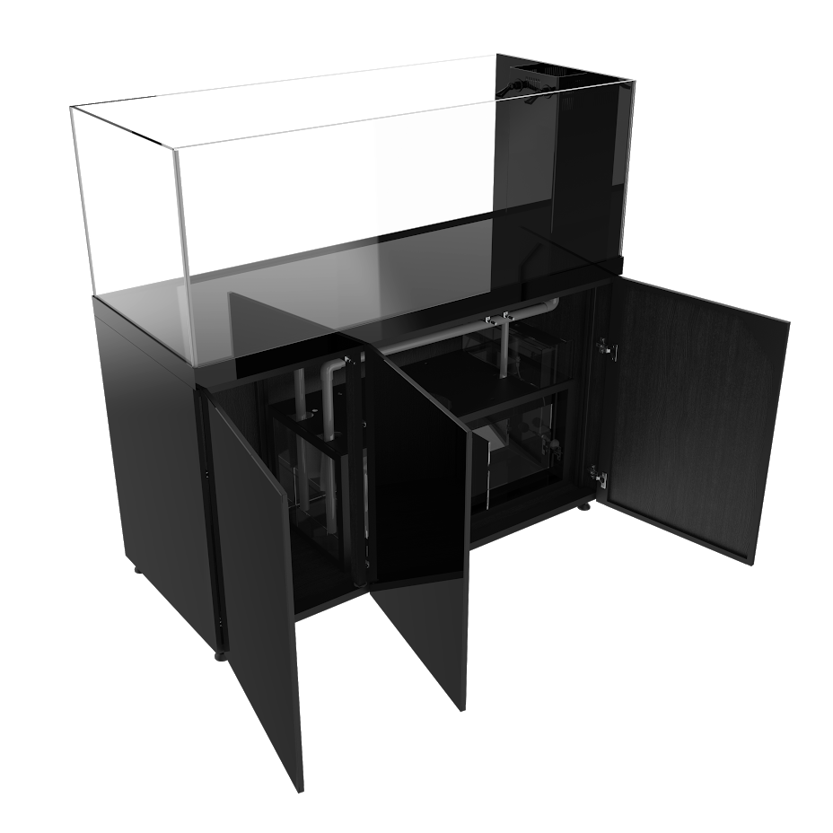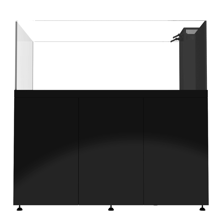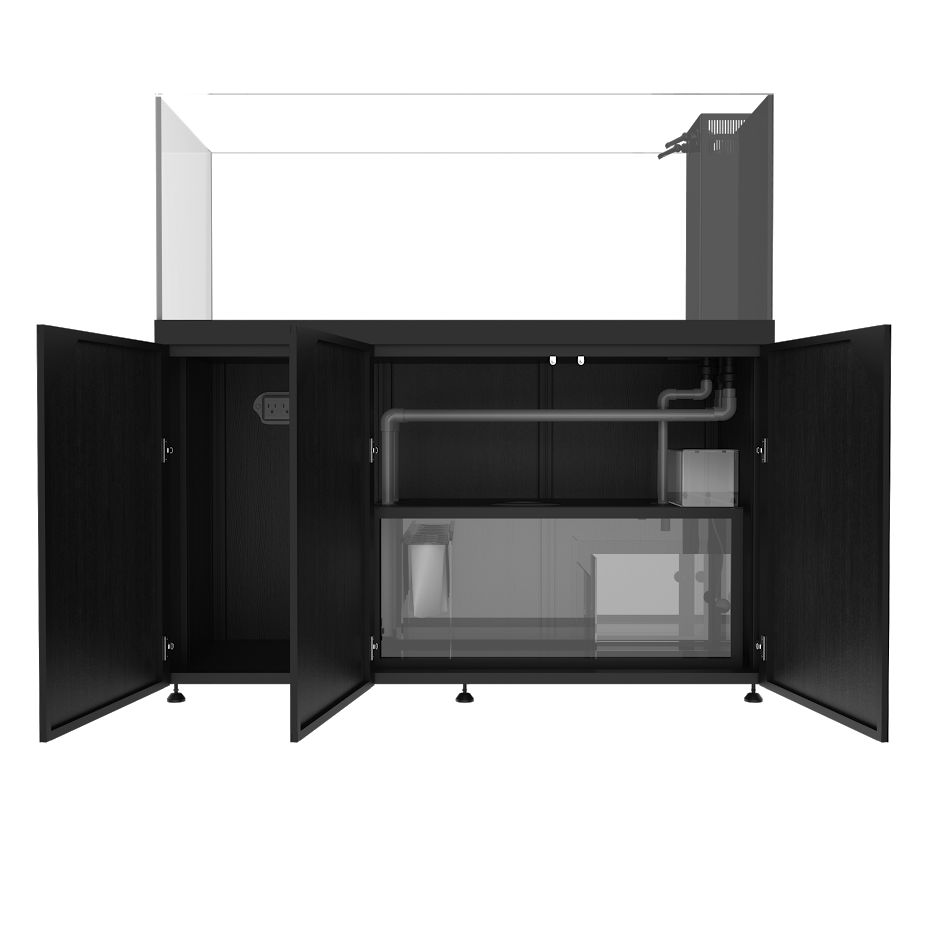 Hobby-friendly peninsula style aquarium system loaded with high-end features without the premium price tag. The 200 Gallon ProStar Rimless Peninsula Aquarium with black cabinet stand from Pro Clear Aquatic Systems includes fundamental components for convenient set up of a beautiful freshwater, saltwater, or marine reef aquarium. Built-in overflow is oriented horizontally to maximize panoramic aquarium landscape views. Glass sump filtration system is paired with a gravity-fed ATO (Auto Top Off) system to help combat evaporation and ensure consistent water levels. Generously-sized glass sump filtration system allows for superior filtration and ample room for additional equipment including a protein skimmer. Pre-cut PVC plumbing assembly allows for easy installation.