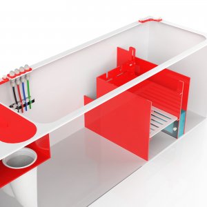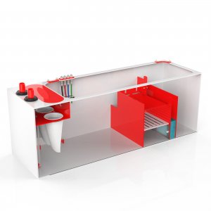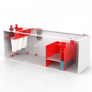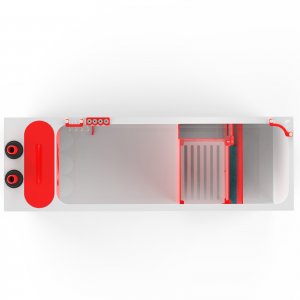 This sump features a modern red and white acrylic design. Water flows through the two overflow ports, into our proprietary bubble diffusers and through the 4 inch 200 micron filter socks.