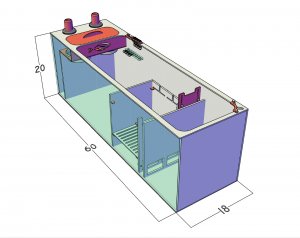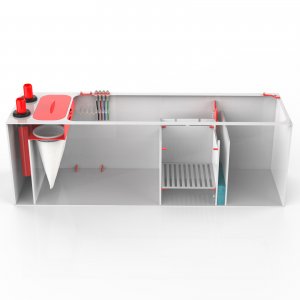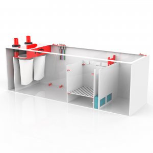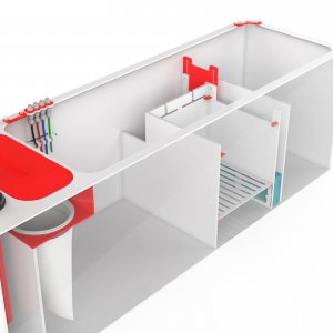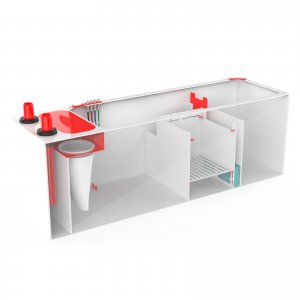 This sump features a modern red and white acrylic design. Water flows through the two overflow ports, into our proprietary bubble diffusers and through the 4 inch 200 micron filter socks.