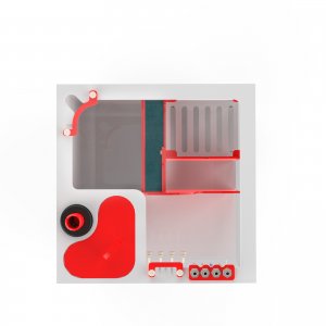 This sump features a modern red and white acrylic design. Water flows through the two overflow ports, into our proprietary bubble diffusers and through the 4 inch 200 micron filter socks.