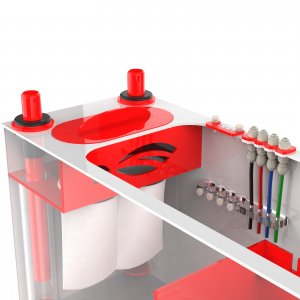 This sump features a modern red and white acrylic design. Water flows through the two overflow ports, into our proprietary bubble diffusers and through the 4 inch 200 micron filter socks.