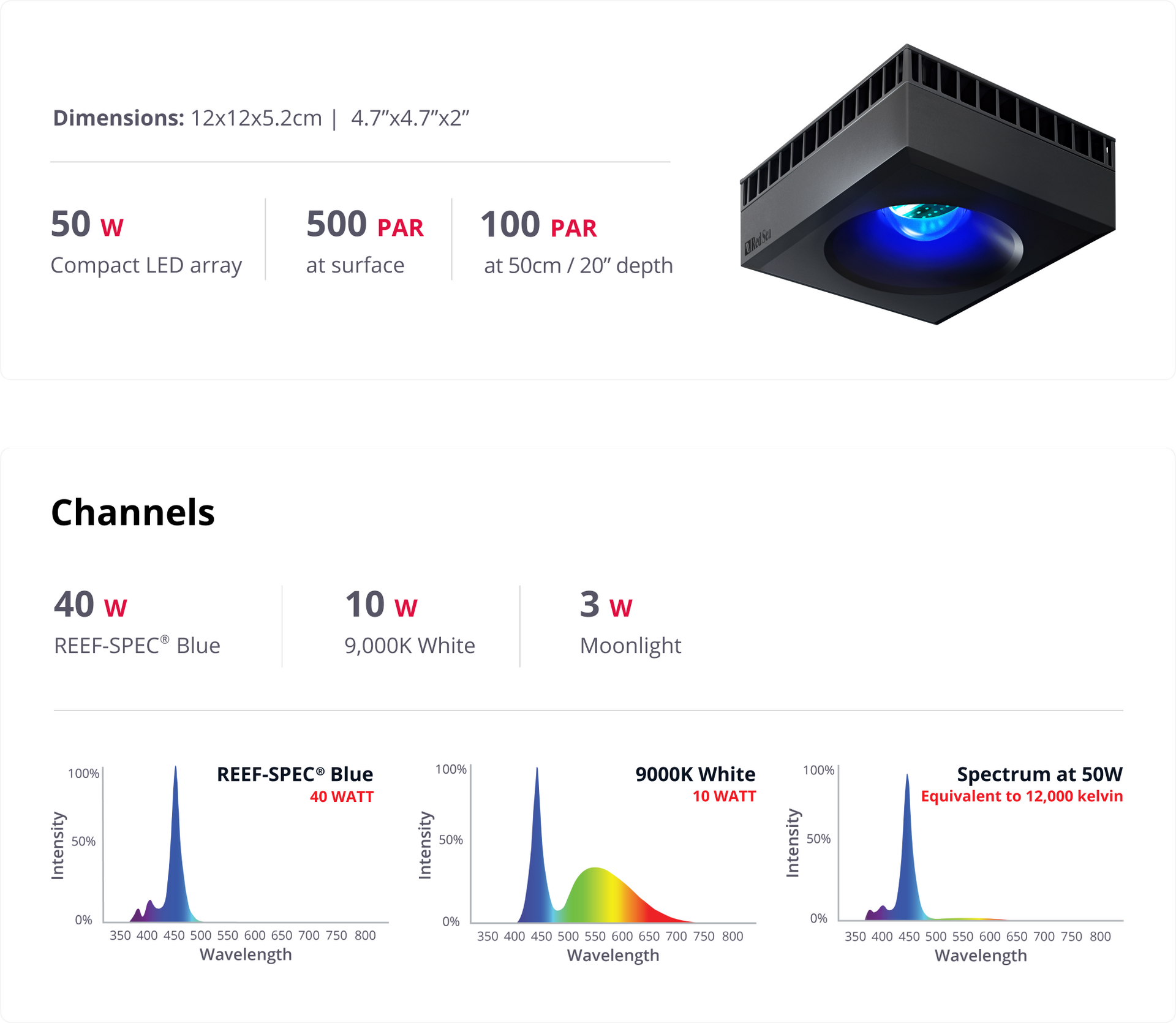 At the heart of each unit is a single, compact LED array, that includes a multi-wavelength 23,000 Kelvin REEF-SPEC Blue (a proprietary blend of blue, violet and ultraviolet LEDs), together with 9,000 Kelvin White, and a separate 3W channel for moonlight. This array enables a wide range of REEF–SPEC light that will please both you and your corals.
