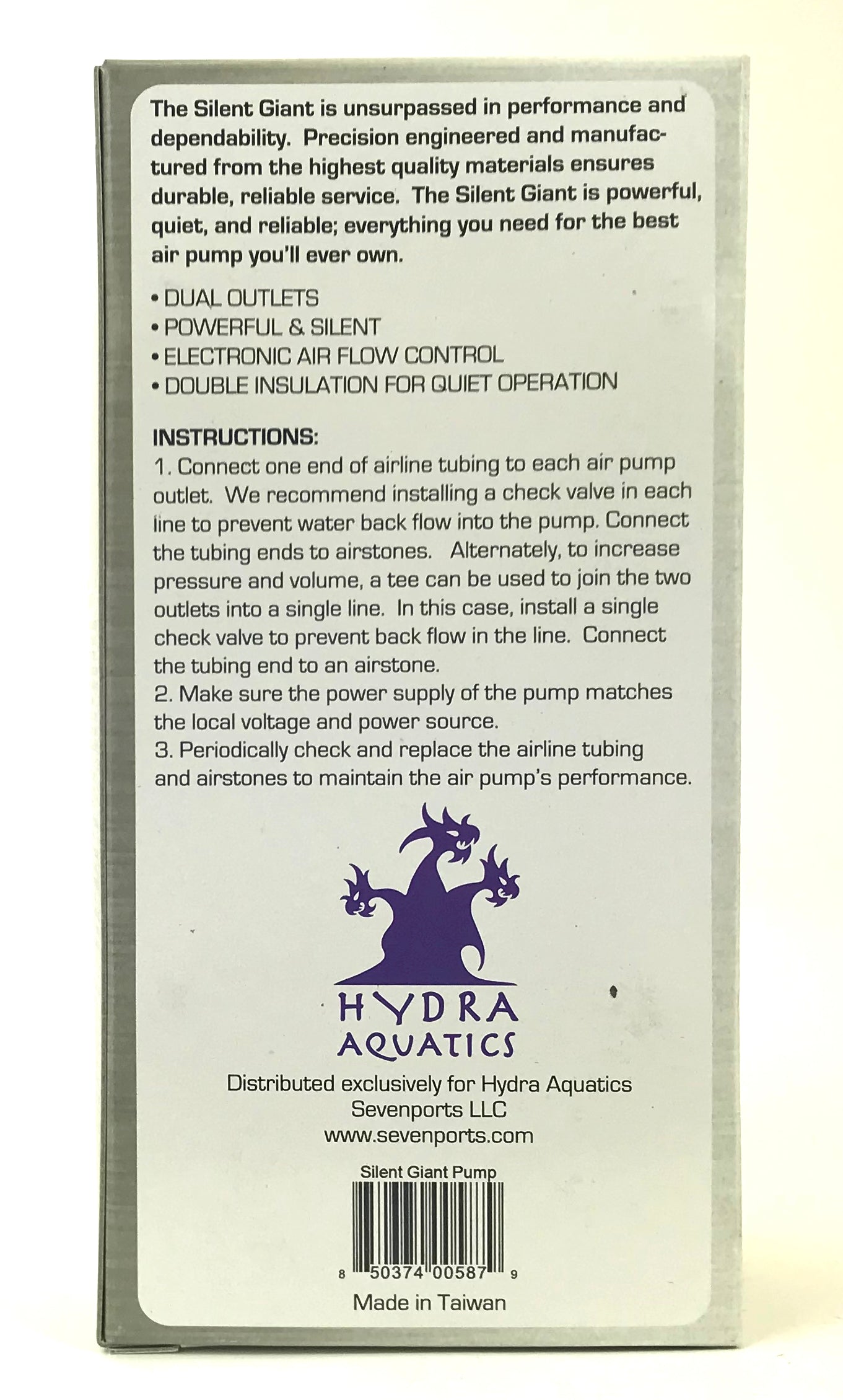 – Noise Level: <30dB – Tank Capacity: 29-200 Gallons The Hydra Aquatics’ Silent Giant is unsurpassed in performance and dependability. Precision engineered and manufactured from the highest quality materials to ensure durable, reliable service, the Silent Giant is the top automatic air pump to meet the demands of the most discriminating hobbyist. Instructions: